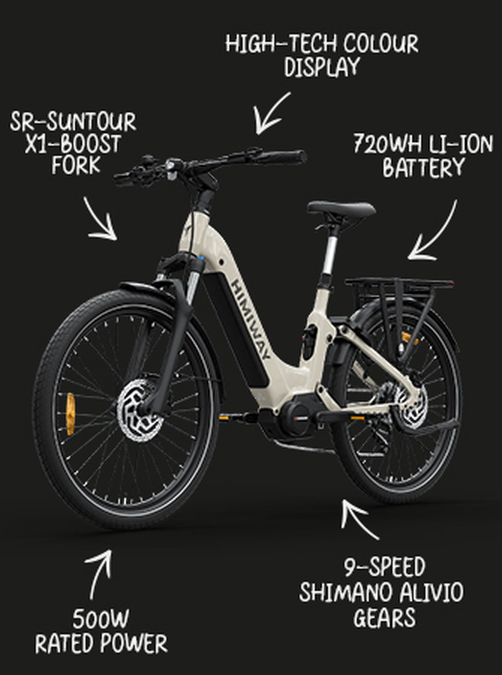 Το ποδήλατο έχει καθαρό σχεδιασμό με χαμηλό step-through πλαίσιο που διευκολύνει την επιβίβαση και την αποβίβαση. Ο σκελετός καμπυλώνει προς τα κάτω αντί να έχει έναν παραδοσιακό άνω σωλήνα, έτσι ώστε οι χρήστες να μην χρειάζεται να αιωρούν το πόδι τους πάνω από τη σέλα. Το ποδήλατο συνοδεύεται από μια πίσω σχάρα ιδανική για τη μεταφορά τσαντών και διαθέτει φτερά πλήρους κάλυψης για να μην εκτοξεύονται νερό και λάσπη στο οδηγός. Το Himiway A7 Pro διατίθεται σε λευκό και μαύρο, μπεζ, σκούρο πορτοκαλί, πράσινο και σμαραγδένιο πράσινο. Θα θέλατε ένα ποδήλατο που τα κάνει όλα Το Himiway A7 Pro είναι ιδανικό αν θέλετε ένα ηλεκτρικό ποδήλατο που να είναι έτοιμο για όλα χωρίς να προσθέτετε επιπλέον εξαρτήματα αργότερα