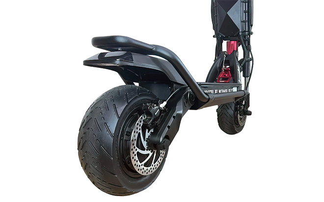 Είστε έτοιμοι να εξερευνήσετε Τα ανθεκτικά ελαστικά 11 ιντσών του Wolf King GT Pro χωρίς σωλήνες, σε συνδυασμό με την ανάρτησή του, εξασφαλίζουν ομαλή οδήγηση. Βεβαιωθείτε ότι έχετε επιλέξει τη σωστή έκδοση για το δρόμο ή το έδαφος. Τα εντυπωσιακά υδραυλικά φρένα εμπρός και πίσω με δίσκους 160 mm και σύστημα eABS φροντίζουν για την ασφάλειά σας. Η ανακτητική φόρτιση επιστρέφει λίγη ενέργεια στην μπαταρία σας.