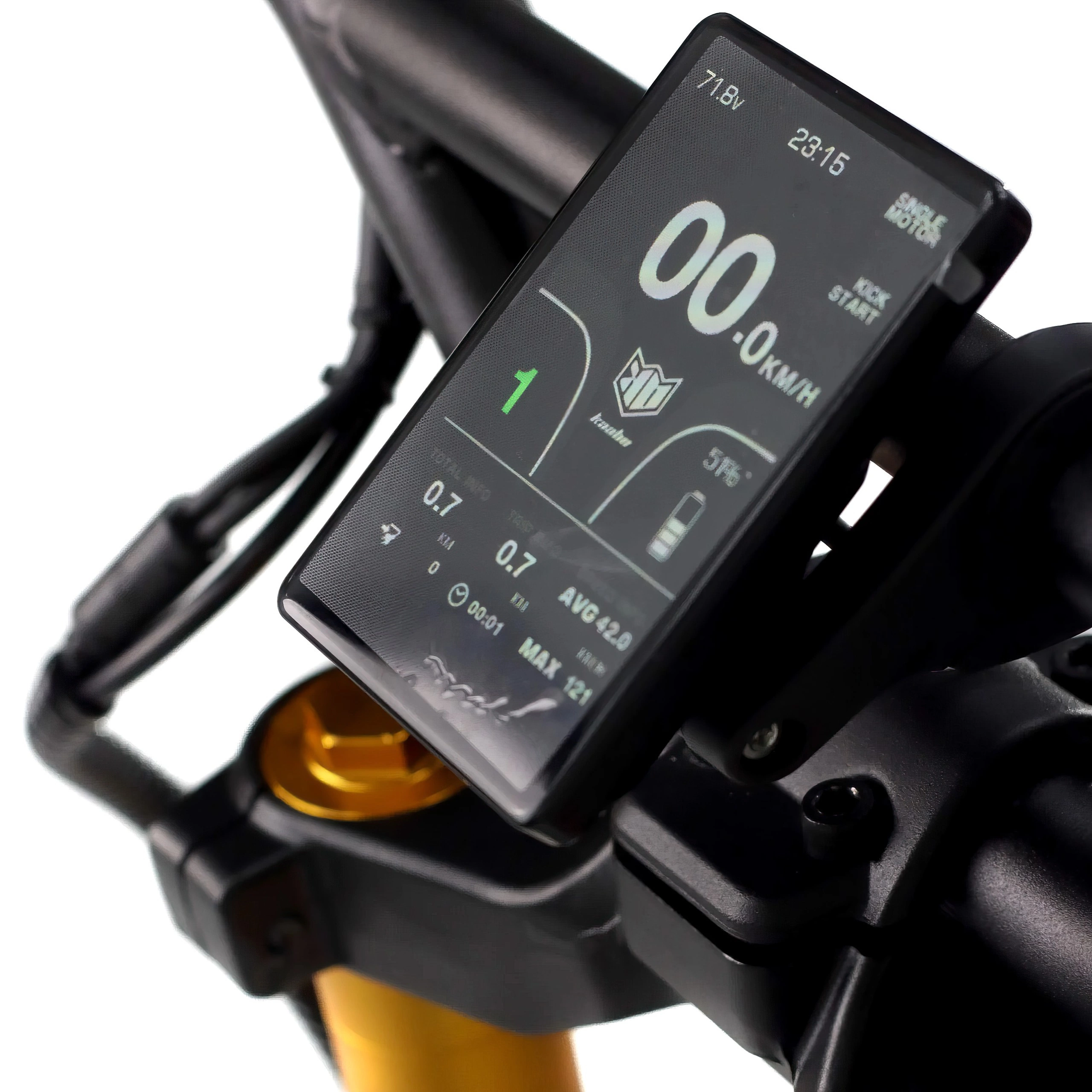 Μείνετε ενημερωμένοι και έχετε τον έλεγχο με την έγχρωμη οθόνη TFT 4,2". Εκεί μπορείτε να βρείτε όλες τις απαραίτητες πληροφορίες, συμπεριλαμβανομένης της ταχύτητας και της υπολειπόμενης εμβέλειας. Με τις λειτουργίες αντιθαμβωτικής προστασίας και αυτόματης εξασθένισης, η προσαρμογή των ρυθμίσεων ή των λειτουργιών είναι εύκολη. Για την ασφάλειά σας, διαθέτει προστασία με κωδικό πρόσβασης. Το ευαίσθητο γκάζι αντίχειρα εξασφαλίζει λεπτή διαμόρφωση της ταχύτητας.