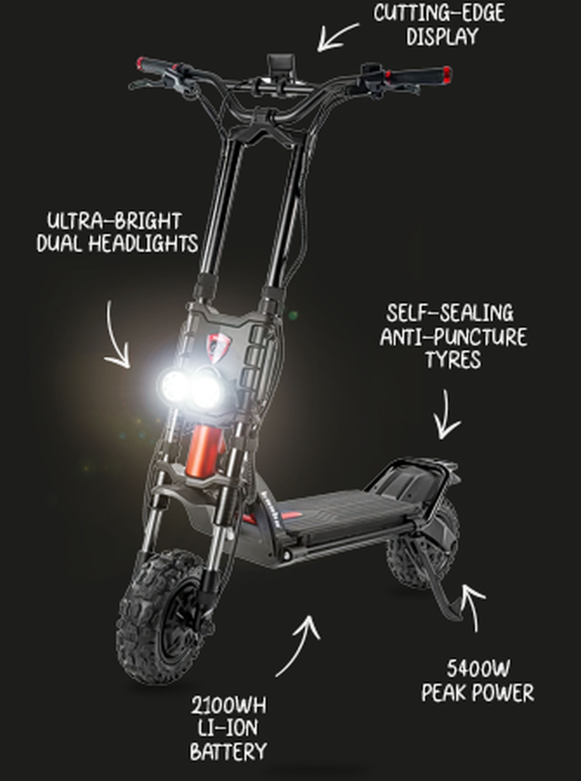 Εξοπλισμένο με δύο κινητήρες 1200W, το Wolf Warrior GT Pro διαθέτει μέγιστη ισχύ 5400W. Αυτή η ισχυρή διάταξη του επιτρέπει να φτάνει σε μέγιστες ταχύτητες 81 χλμ/ώρα (50mph), παρέχοντας συναρπαστική επιτάχυνση και στιβαρές επιδόσεις.